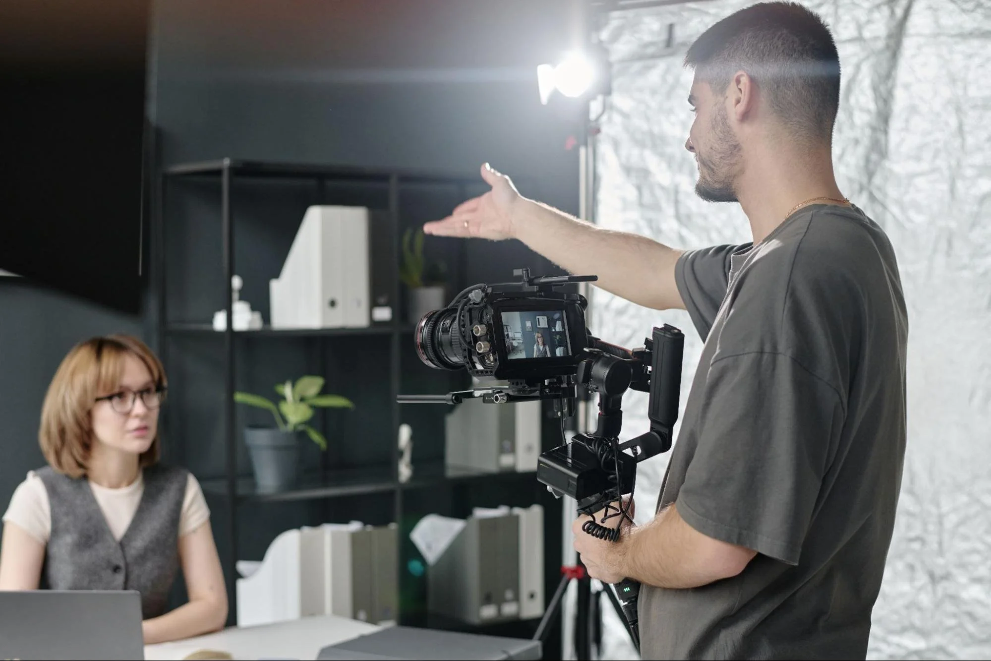 Filming: Setting up multiple cameras and professional lighting to capture the best possible shot during the interview.